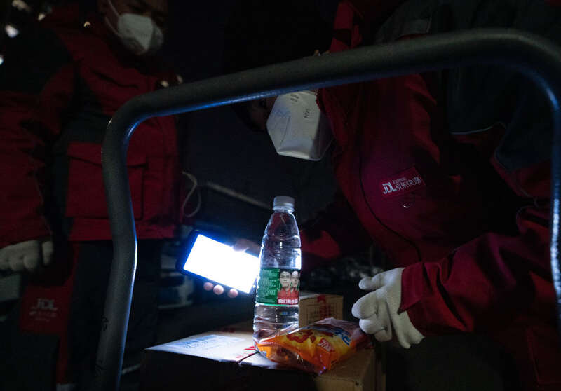 ↑在北京市大兴区新源时代小区,一位居民给快递小哥送来水和火腿肠,此时齐帅龙、高兴兴还没有吃晚饭(12月15日摄)。