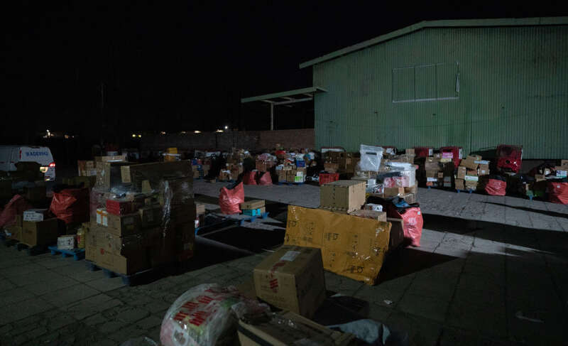 ↑货物码放在京东快递天宫院营业部的场地上(12月15日摄)。