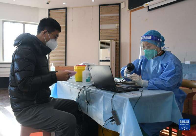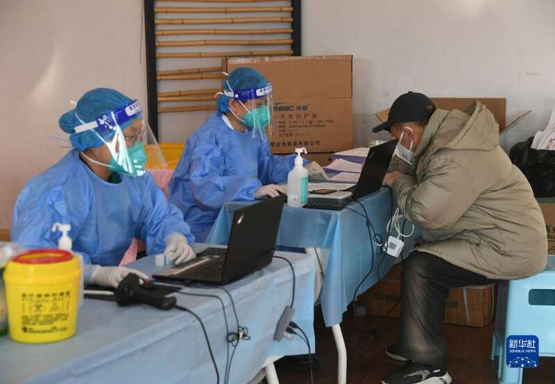 12月17日,在北京市海淀区田村路街道新冠疫苗临时接种点,医护人员为市民登记信息。