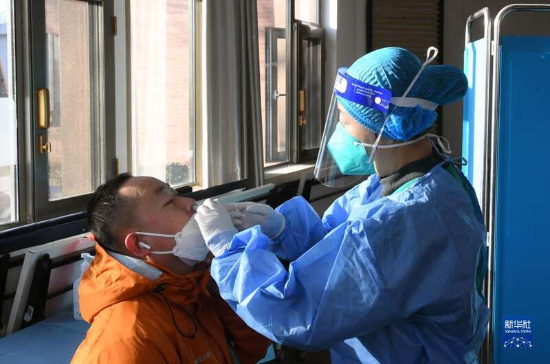 12月17日,在北京市海淀区田村路街道新冠疫苗临时接种点,医护人员为市民接种鼻喷第二剂次加强针。