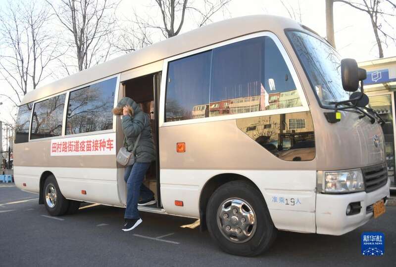 12月17日,在北京市海淀区田村路街道新冠疫苗临时接种点,一名老人从“暖心巴士”下车准备接种新冠疫苗。
