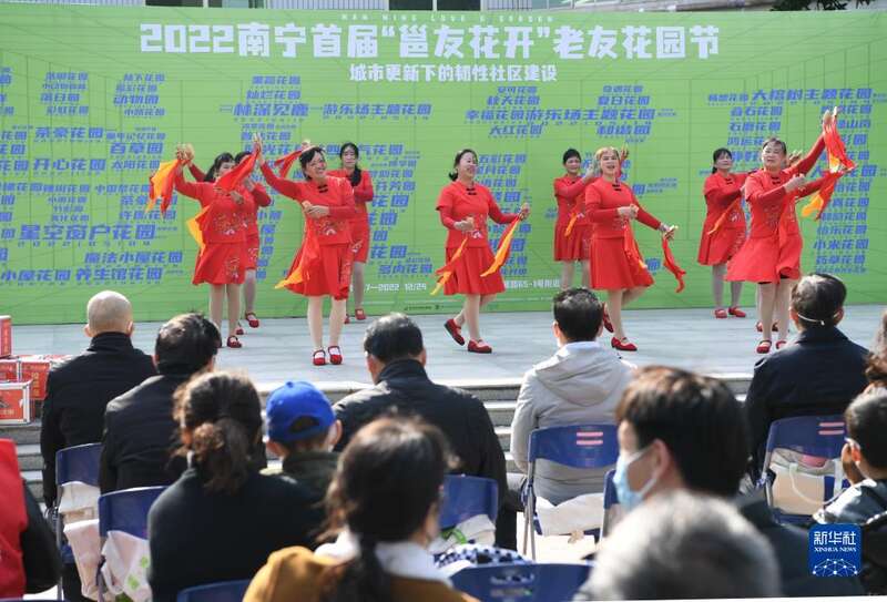 12月17日,2022南宁首届“邕友花开”老友花园节在青秀区南湖小区中心花园开幕。这是居民在表演节目。
