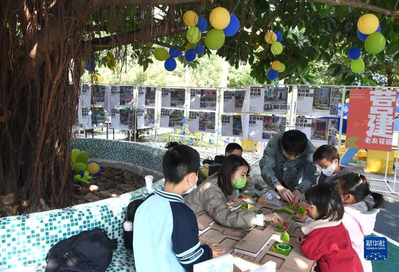 12月17日,孩子们在南宁市青秀区南湖小区改造后的中心花园做手工。
