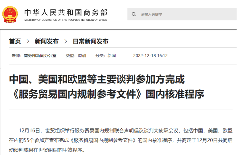 商务部今天(18日)消息,12月16日,世贸组织举行服务贸易国内规制联合声明倡议谈判大使级会议,包括中国、美国、欧盟在内的55个参加方宣布完成《服务贸易国内规制参考文件》的国内核准程序,并商定于12月20日共同启动谈判成果在世贸组织的生效程序。