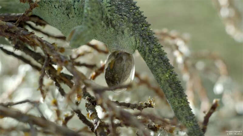 在赤道附近的东非,白天,热带的阳光洒在肯尼亚山的山坡上,驱散了寒冷;但是到了晚上,随着气温骤降,便会出现霜冻。在这里,《冰冻星球2》的摄制团队首次拍摄到头盔变色龙生产的全过程。大多数变色龙会以产卵的方式繁衍下一代,但在肯尼亚山,由于夜晚温度极低,卵在野外无法被孵化,因此头盔变色龙会直接在体内孵化并产下小头盔变色龙,这个过程便是胎生发育。