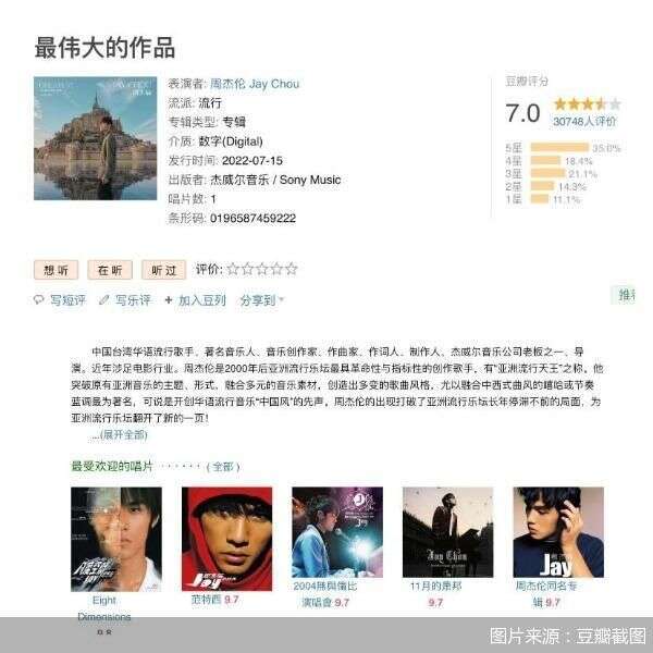 不久前,周杰伦举办线上“歌友会”,不仅通过直播演唱多首经典歌曲,还同“老搭档”方文山连麦互动,公开资料显示,最终直播最高同时在线人数超1129万,总点赞数超10.5亿;而酝酿多年的新专辑《最伟大的作品》于2022年中发售,数字专辑截至目前已售出超700万份,总销售额超2亿元,位列多家音乐平台数字专辑畅销榜榜首。公开资料显示,此前的直播活动周杰伦曾因嗓音沙哑和高音问题引发观众吐槽,而《最伟大的作品》豆瓣开分仅7分,远低于此前专辑均分9.5分的表现。