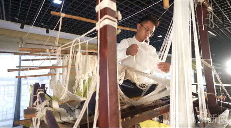 师父杨建顺让陈诚先从拽花工学起:先手脚并用爬上高达4米的大花楼织机,再反复提拉花本上的耳子线带动大纤,把花纹传到织口供下面织手挖花盘织。原理看似简单,但其实颇考验手速眼力,陈诚初学就遭遇了“眼会了,手却没跟上”的窘境。师父杨建顺看在眼里,适时为其指点迷津:“一抡、二掀、三抄、四会、五提、六捧、七拽、八掏、九撒”,在这套朗朗上口的拽花古法口诀的加持下,陈诚渐渐跟上了节奏。