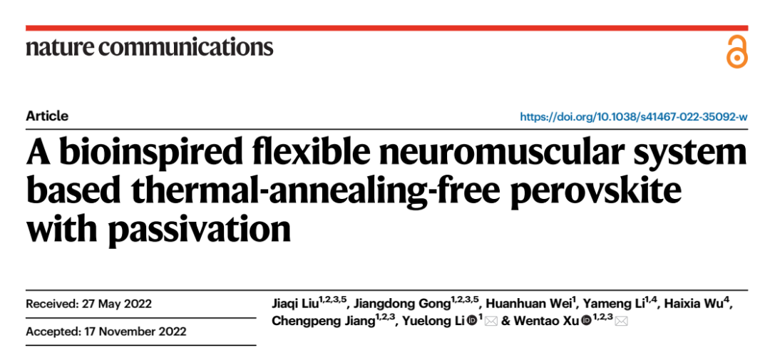 徐文涛教授团队和李跃龙副教授团队共同提出一种无需退火工艺的钙钛矿基柔性人工突触器件,通过新的全室温结晶钙钛矿半导体有源层解决方案,得到高质量00l取向钙钛矿薄膜,规范了载流子迁移路径,辅以钝化工艺,进一步减小空位等缺陷密度,成功打破了两端突触器件的最低能耗世界纪录,实现了每次脉冲尖峰下13.5aJ(即不到一粒大米热量的1/1018)的超低能耗和高达4.17MHz的超快稳定响应频率。