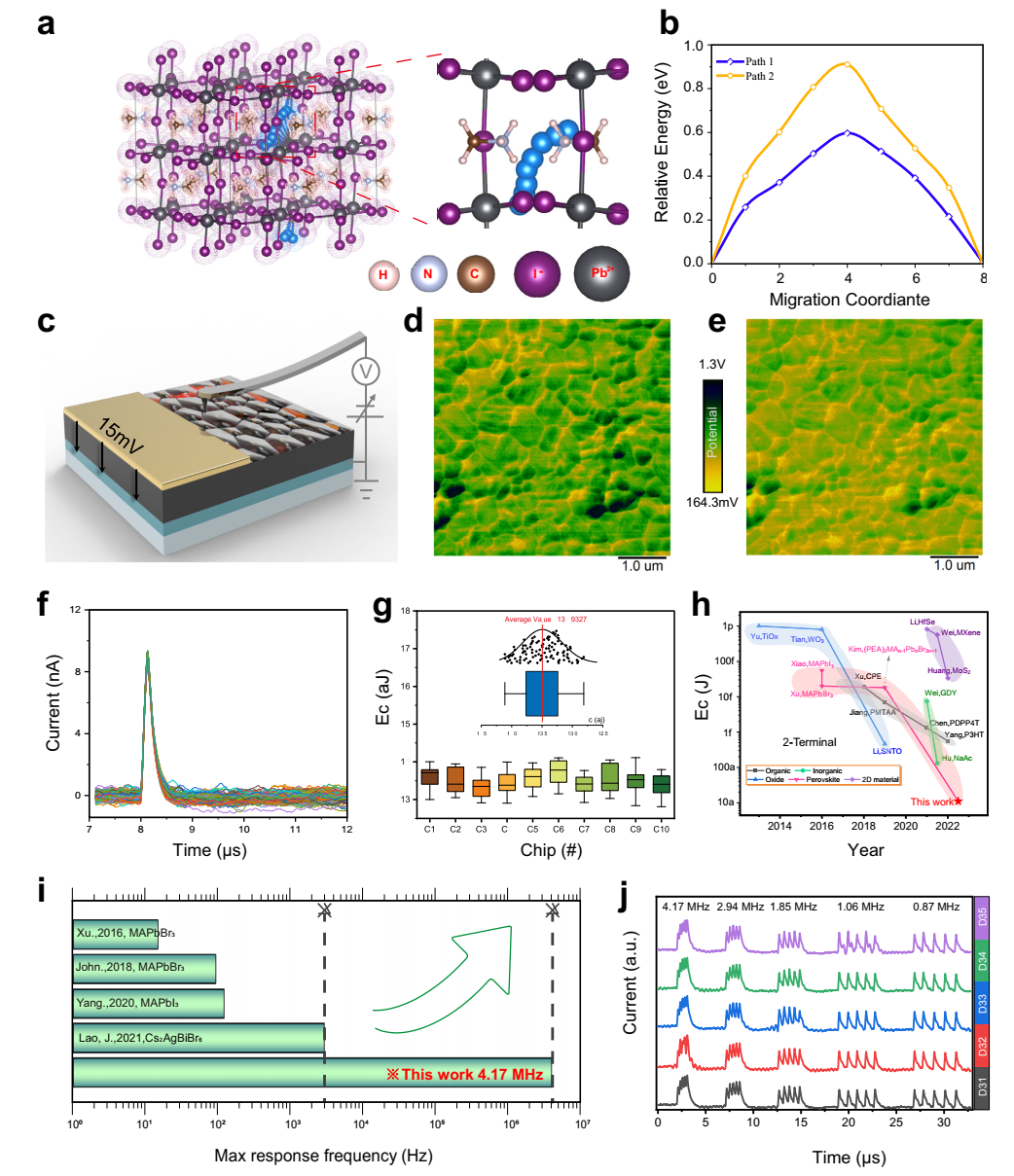 上图:a 理论预测室温钙钛矿中载流子的迁移路径;b DFT计算不同路径下I-空位迁移活化能;c 自研改装原位面电势测试装置;d,e 离子迁移前后钙钛表面电势;f 突触器件兴奋性后电流;g 器件能耗可重复性验证;h,i 与其他先进研究成果的对比;j 超高频率下的突触脉冲尖峰速率依赖可塑性(Spike-rate-dependent plasticity)研究。