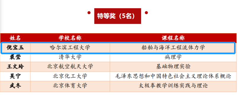 近日,第四届全国高校混合式教学设计创新大赛总决赛落下帷幕。哈工程船舶学院倪宝玉教授主讲的《船舶与海洋工程流体力学》荣获特等奖。