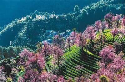 冬日,位于云南省南涧彝族自治县的无量山樱花谷迎来樱花绽放,如云似霞的樱花与碧绿如染的茶园交织在一起,构成了一道亮丽的风景。适志宏摄(人民图片)