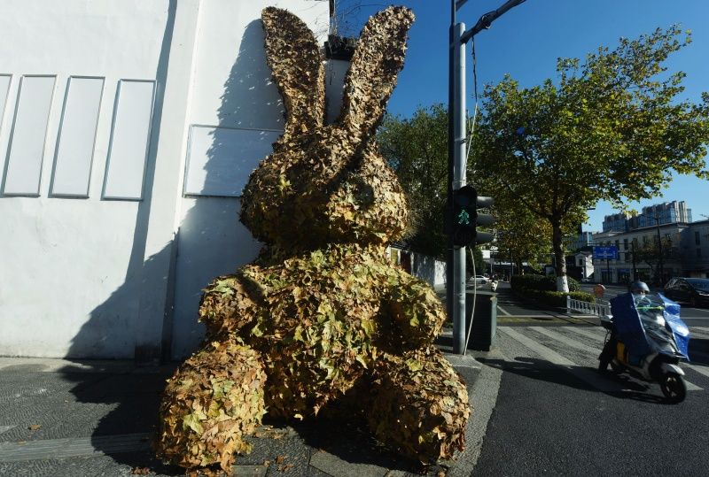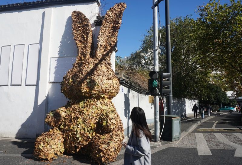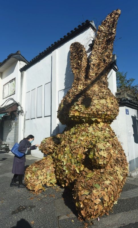 近日,随着中国农历癸卯兔年临近,一只高度超过4米的巨型“树叶兔”亮相杭州街头,吸引不少路过市民的关注。