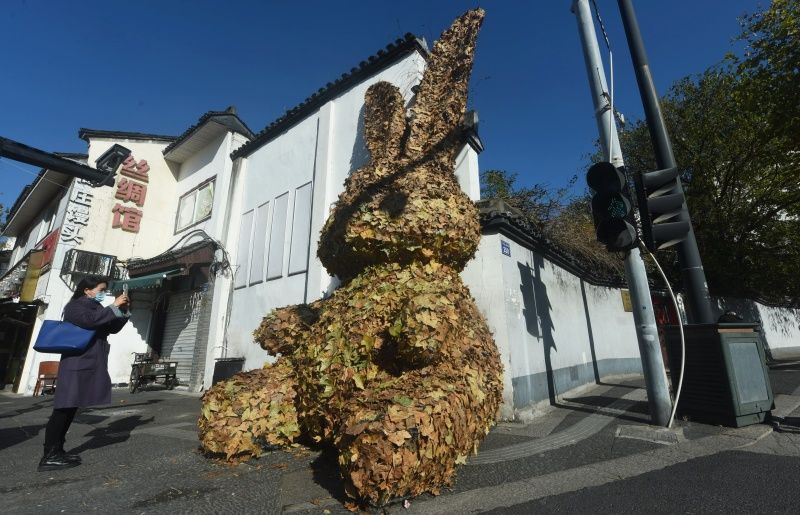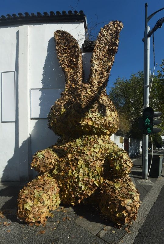 据了解,这只巨型“树叶兔”由在杭州的艺术高校大学生创作,旨在倡导人们对自然环境的关注。