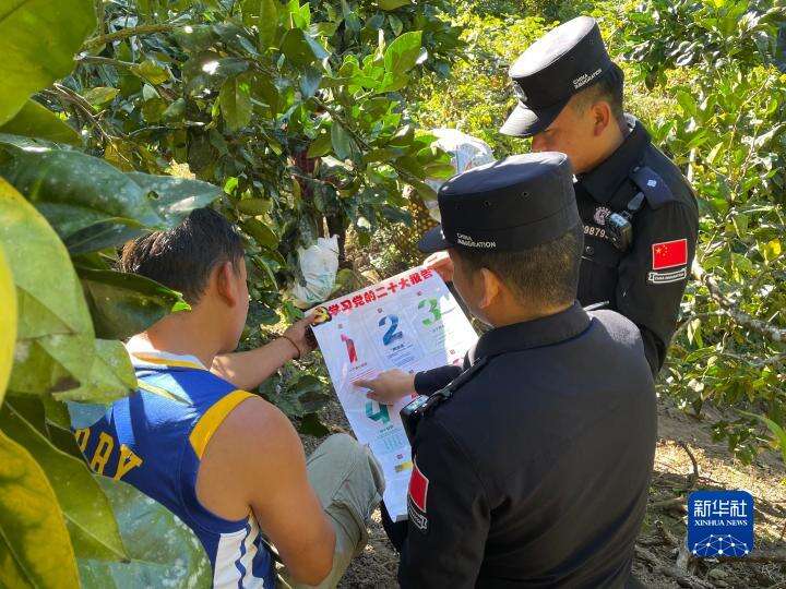 墨脱县边境派出所民警在墨脱镇米日村蜜桔种植基地为群众宣讲党的二十大精神。