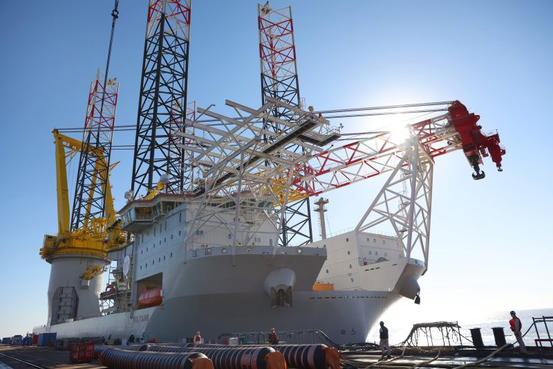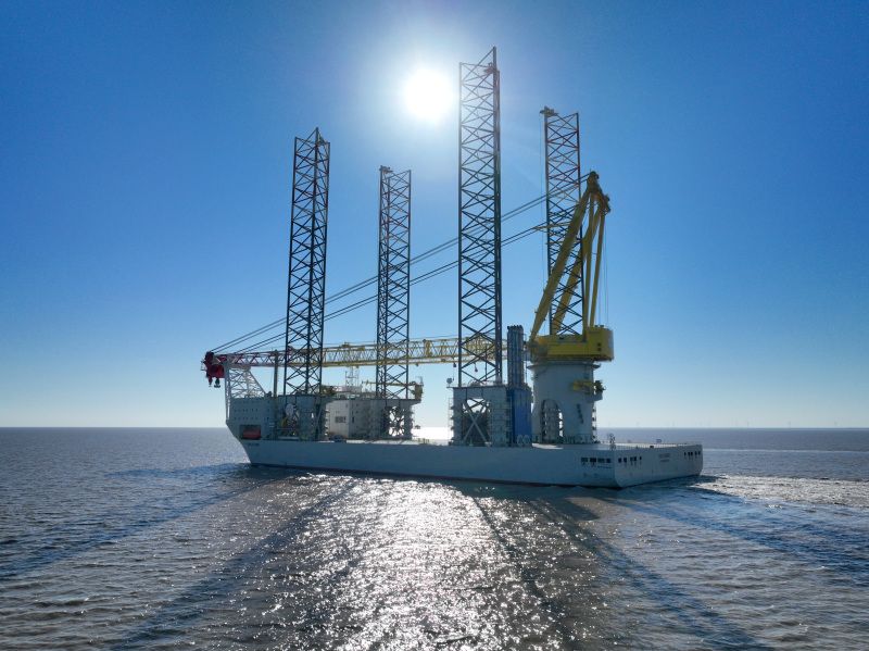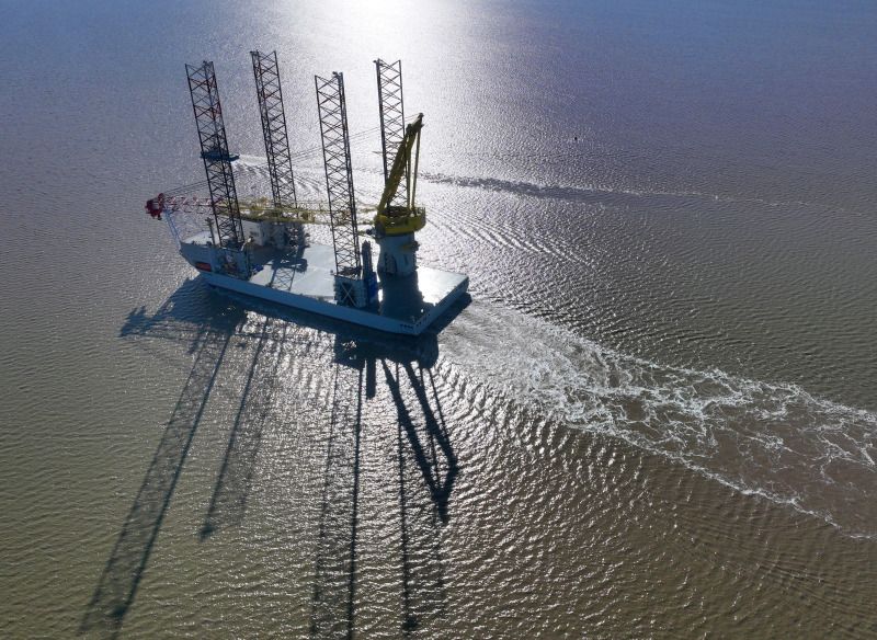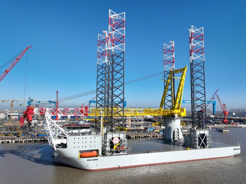 2022年12月20日,江苏南通,由江苏启东中远海运海工为比利时订制的N966自升式风电安装船交付启航,将赴英国北海服务全球最大规模海上风电场Dogger Bank风电场。