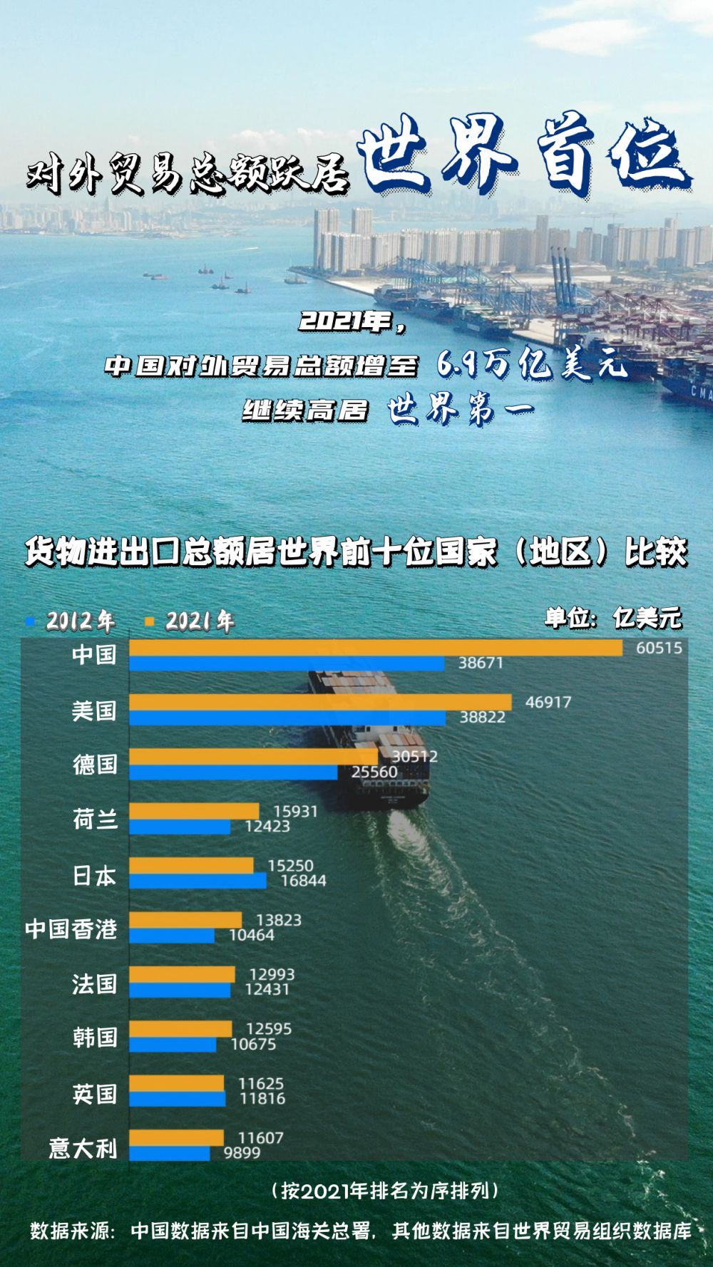 2020年中国对外贸易总额由2012年的4.4万亿美元升至5.3万亿美元,首超美国成为全球第一大贸易国。2021年,中国对外贸易总额加快上升增至6.9万亿美元,继续高居世界第一。在经济全球化频遭单边主义、保护主义等“逆流”袭扰的历史当口,中国从融入和适应全球化走向推动和引领全球化,积极倡导建设开放型世界经济,推动经济全球化朝着更加开放、包容、普惠、平衡、共赢方向发展。目前,中国已成为140多个国家和地区的主要贸易伙伴,形成更大范围、更宽领域、更深层次对外开放格局。