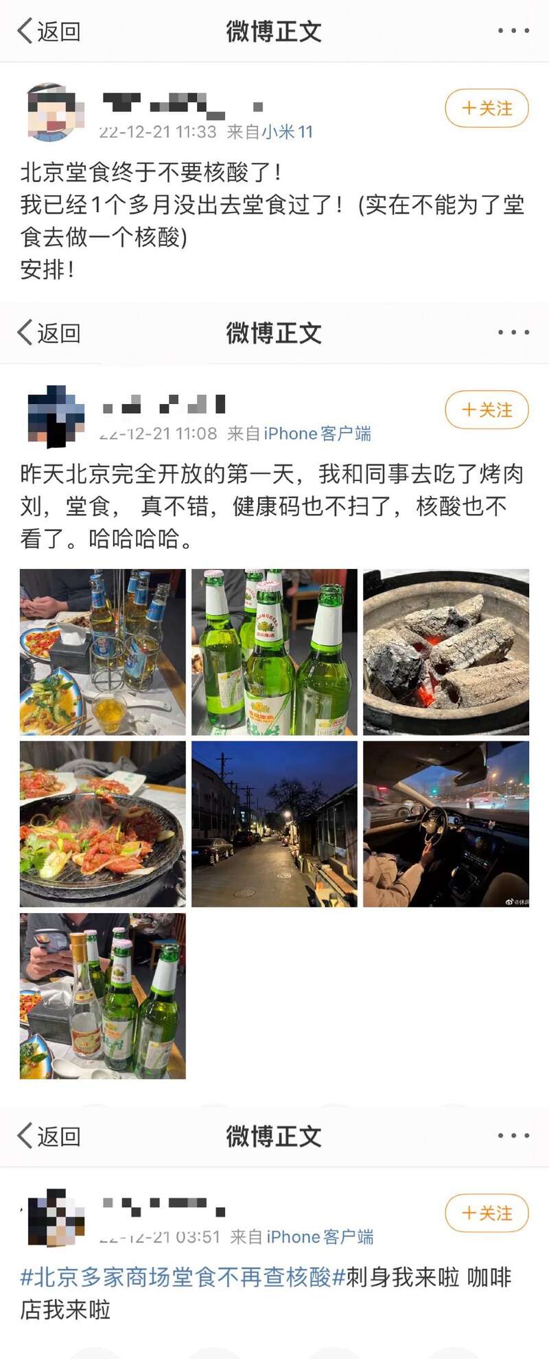 20日,北京多家商场发出通知,餐饮堂食不再查验核酸检测阴性证明。当晚,可女士便和朋友约着吃了一顿烤肉。“我上次出门堂食还是在11月中旬,因为排队核酸的感染风险比较大,所以只有工作需要才会去做核酸。现在不查核酸了,终于可以随时随地和好友约火锅烧烤了。”可女士说。