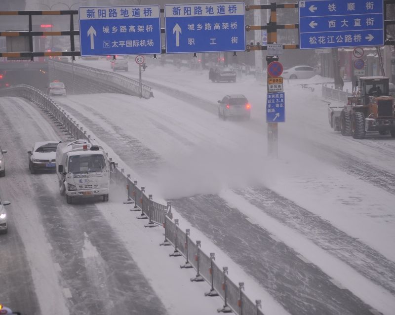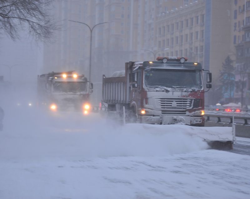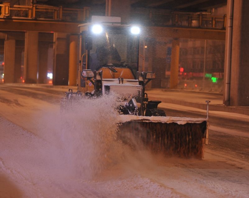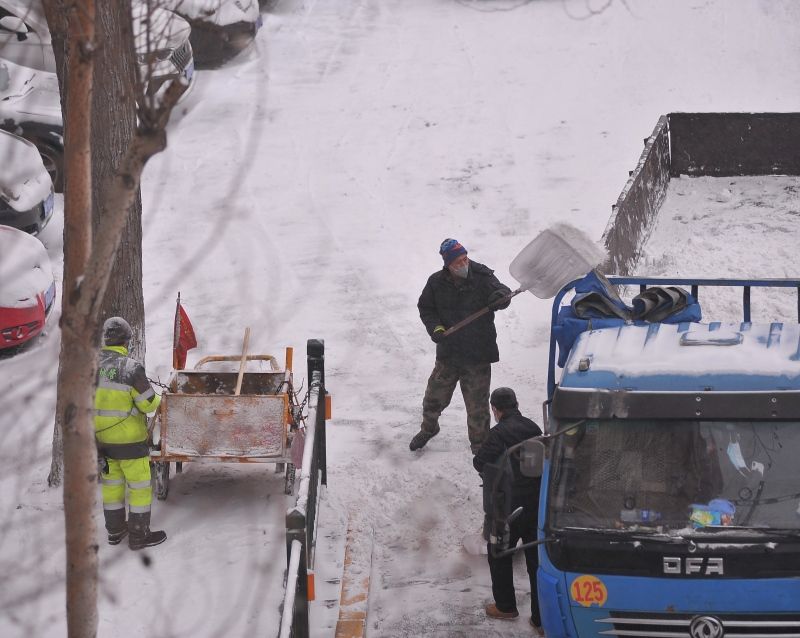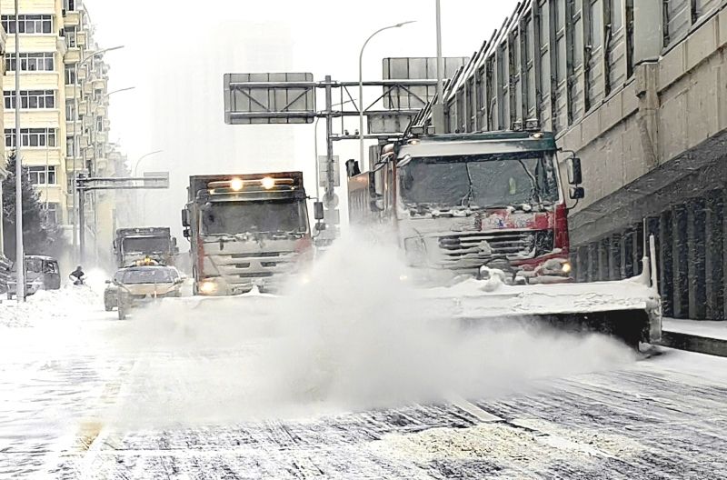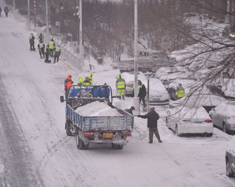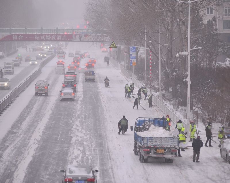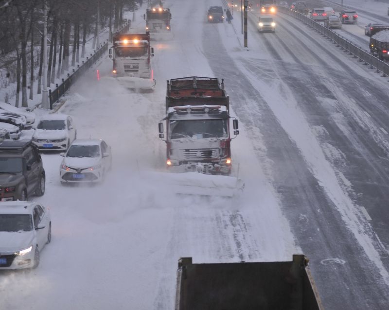 2022年12月21日,哈尔滨,气象部门发布暴雪蓝色预警,清除积雪的车辆和人员24小时不停作业,减小降雪对城市交通的影响。