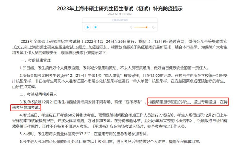 此前,多地发布《2023年全国硕士研究生招生考试(初试)考生须知》。依据安排,上海、吉林等多地准备了“阳性考场”。