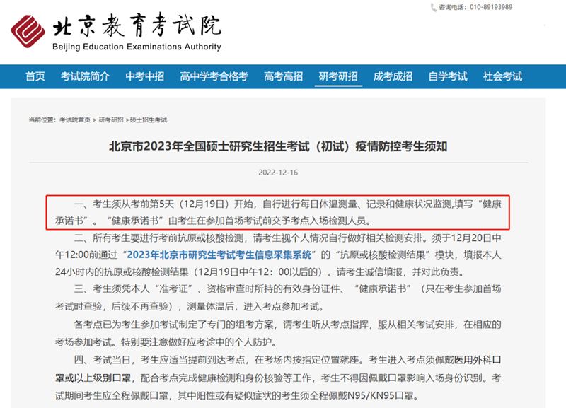 △北京教育考试院发布公告:考生须从考前第5天(12月19日)开始,填写“健康承诺书”。