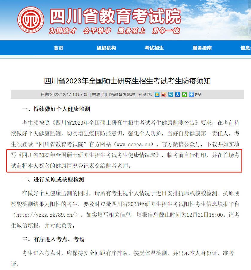 △四川省教育考试院发布公告:考生须下载并填写相关健康情况表,并在首场考试时交给监考老师。