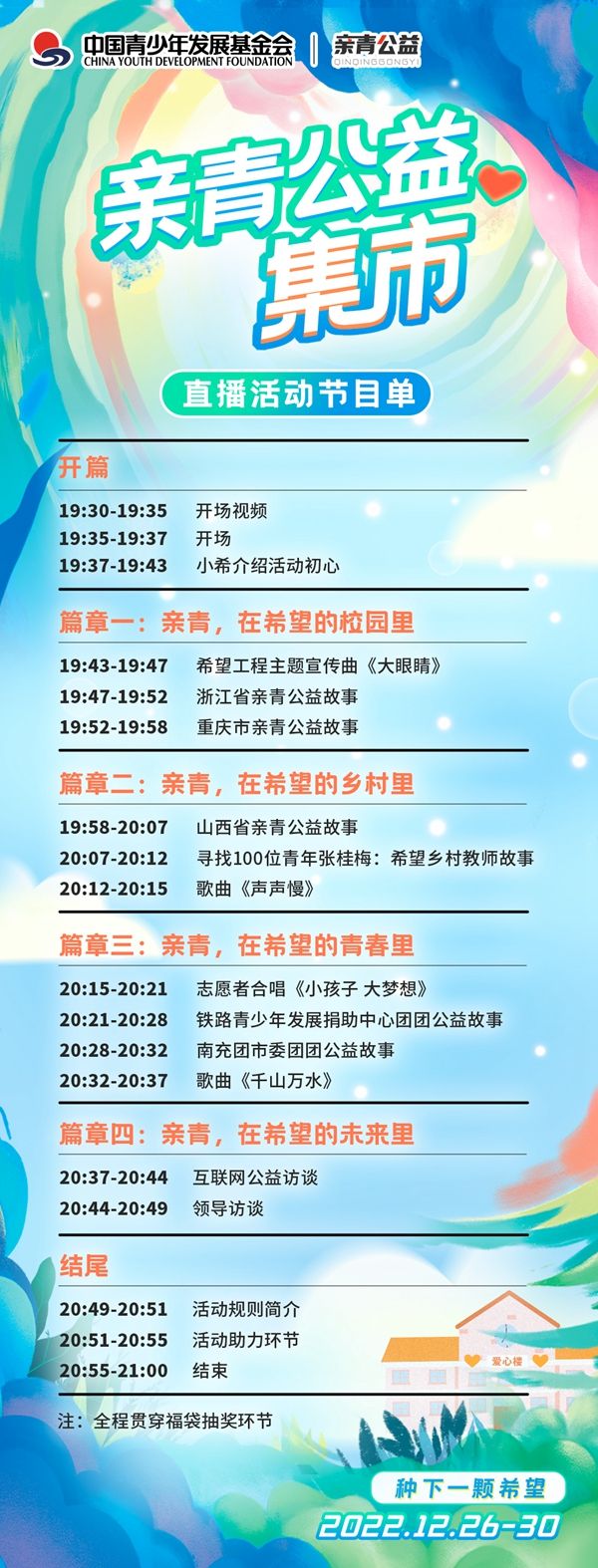 12月26日 19:30,“种下一颗希望”亲青公益集市将在“希望工程”视频号开始网络直播,届时将于12月26-30日开展网络众筹活动。