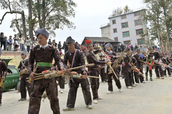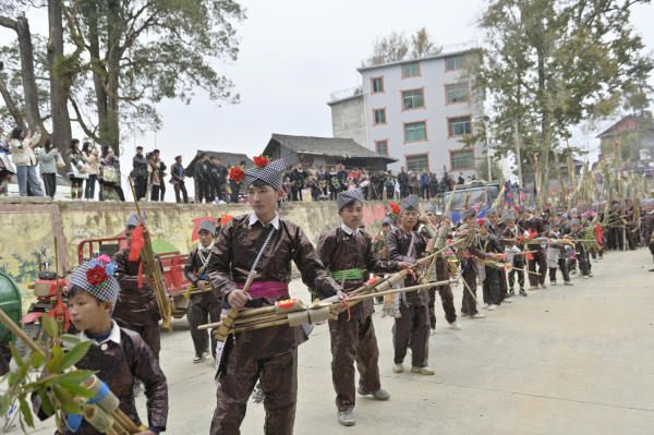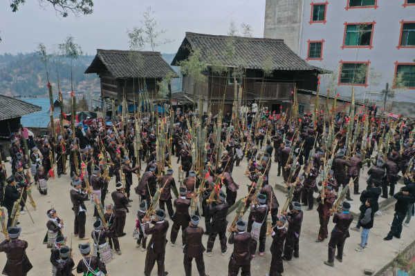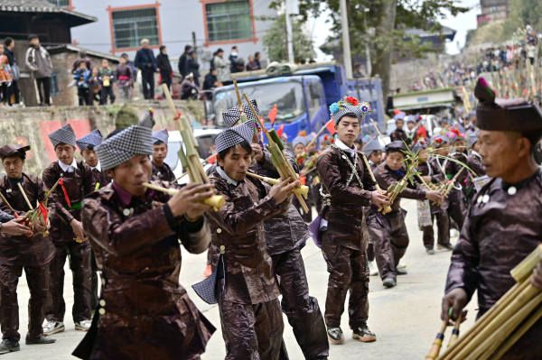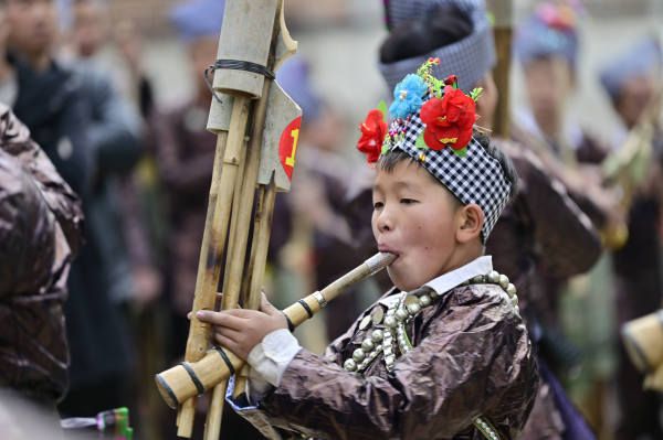 当日,贵州省黔东南苗族侗族自治州从江县丙妹镇大塘村迎来一年一度的传统苗年,当地苗族同胞身着节日盛装吹奏芦笙,载歌载舞欢庆佳节。