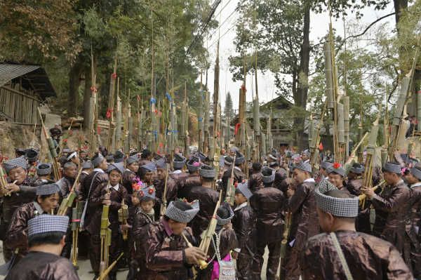 2022年12月23日,贵州从江,丙妹镇大塘村,苗族同胞在演奏芦笙。