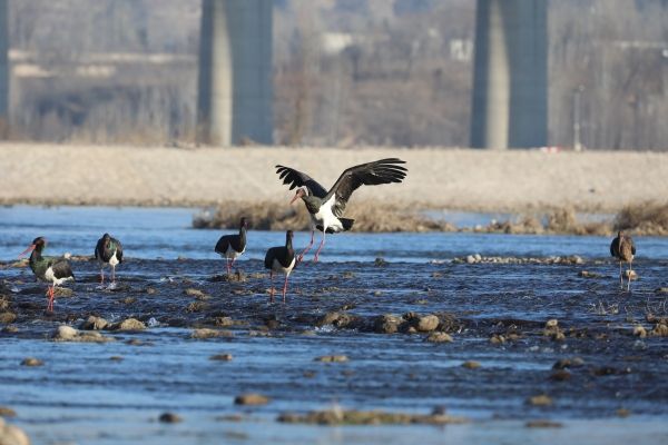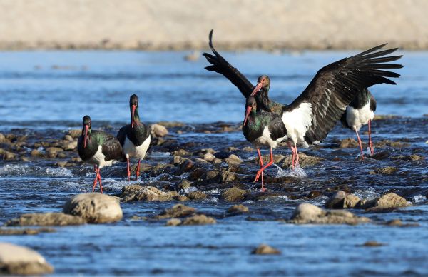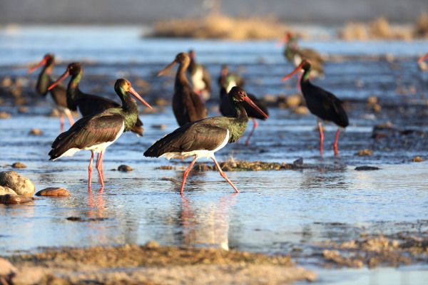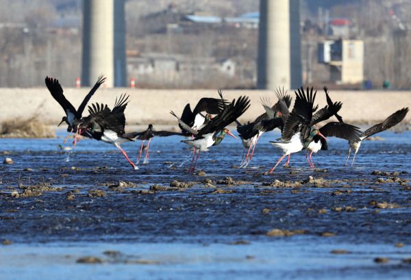 2022年12月22日,石家庄,一群黑鹳在井陉县境内的绵蔓河觅食。