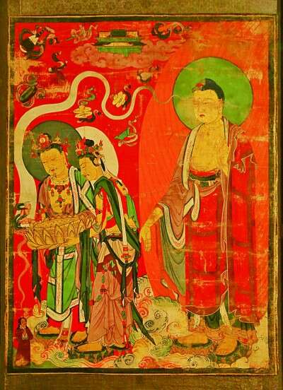 另外,西夏与藏传佛教的接触,始于1159年。是年,夏仁宗遣使入藏,专程迎请藏传佛教高僧噶玛噶举派创始人都松钦巴。都松钦巴遣弟子藏索格西来到西夏,被仁宗尊为上师,开始组织力量大规模翻译佛经。藏传佛教真正对西夏形成大的影响,应自藏索格西到达西夏始,至1227年西夏灭亡。藏传佛教在西夏国的流行大约在半个世纪左右,也就是西夏晚期。因此,关于唐卡的年代,应以藏索格西1159年抵达西夏的时间作为其断代的开始,以汉地风格丝质卷轴画《戴冠佛》为下限。此幅《戴冠佛》佛右手持有“天元通宝”的钱币,“天元”年号是北元末代皇帝的孙子脱古思帖木儿于1378年起用的,他于1388年战死。这年明朝军队在捕鱼儿海(今蒙古东部贝尔湖)获得胜利,此后元朝便灭亡了。那么黑水城应当在14世纪80年代仍然存在。因此,以《戴冠佛》(1378-1388)作为黑水城唐卡断代的下限应是比较切合实际的。