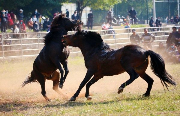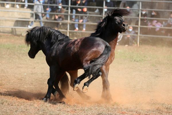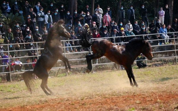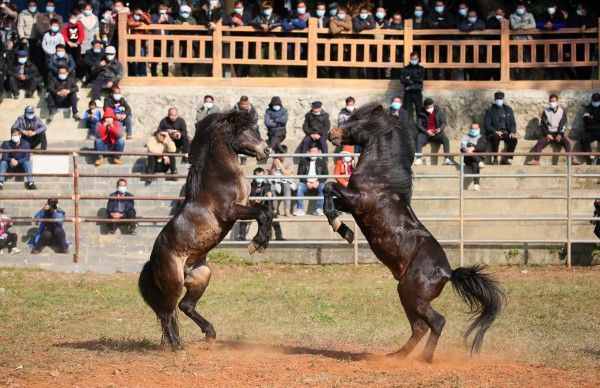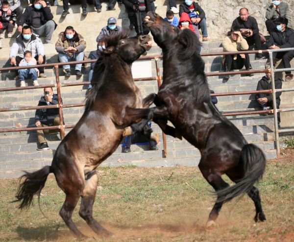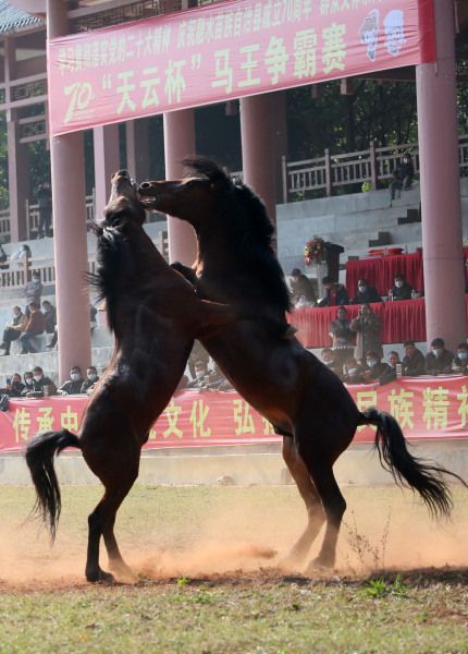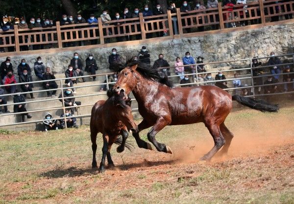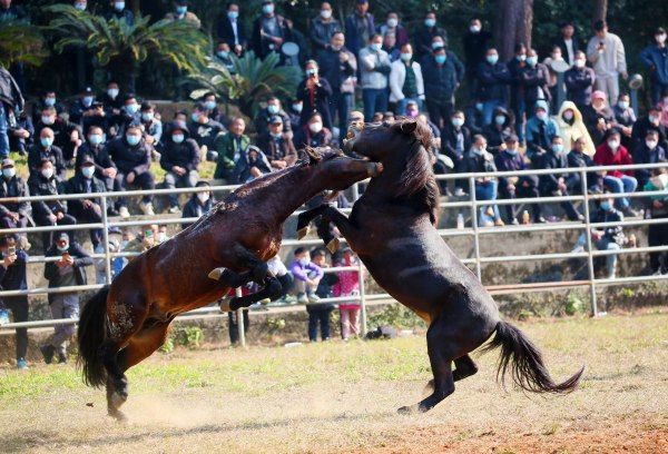 广西融水苗族自治县举行苗年斗马比赛,来自安太、四荣、香粉等乡镇的58匹勇驹,进行踢、咬、追等打斗比赛,祈求风调雨顺、五谷丰登。