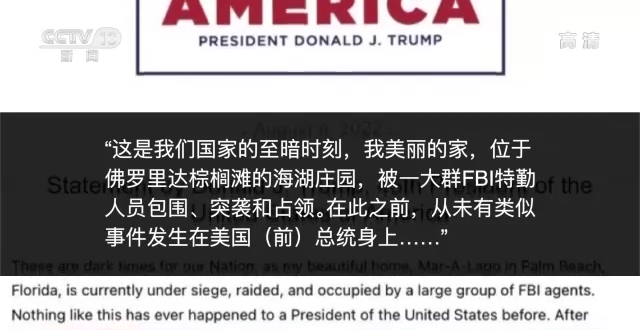 特朗普在被“抄家”后发表声明:“这是我们国家的至暗时刻,我美丽的家,位于佛罗里达棕榈滩的海湖庄园,被一大群FBI特勤人员包围、突袭和占领。在此之前,从未有类似事件发生在美国(前)总统身上……”