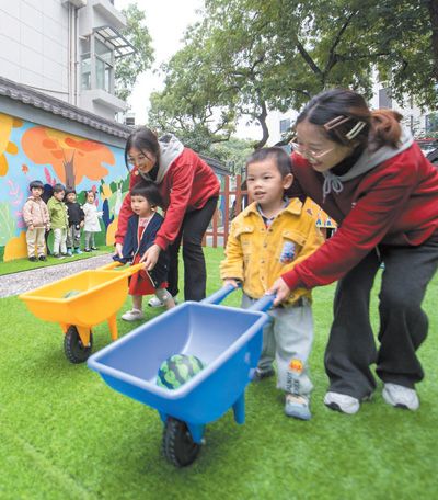 浙江省杭州市西湖区北山街道松木场社区通过加装电梯、整治小区外立面、增设公共绿地、建设邻里中心与托育中心等措施实施老旧小区改造。图为在新建成的社区托育中心,老师带着小朋友们玩游戏。 新华社记者 江汉摄