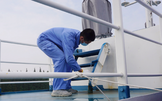 “你拿抹布把水擦干净再涂,你再去调点蓝漆把边描一下,不要太稀了啊,小心点别洒了。”水手谢康乐身着蓝色工作服、头顶安全帽帽、拿着滚筒刷,不厌其烦对新水手们说。经过三个多小时的作业,船舱地面锈蚀部分被细心清除并涂上了干净的油漆。每一次油漆作业,狭小的船舱内都会充斥着呛鼻的气味和刺眼的粉尘,但这却是水手们的日常。