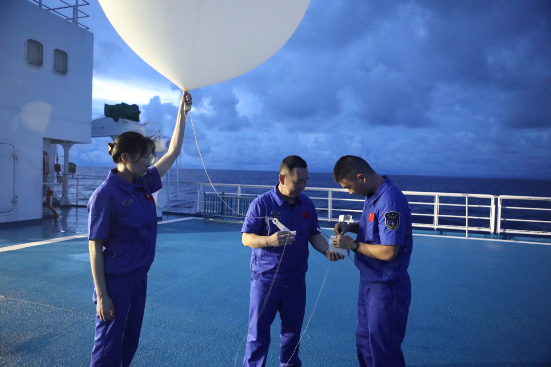 伴着飘扬的国旗和海浪的波涛声,气象组的船员们也来到甲板上进行气象观测。“偏东风4到5级……”气象员包歆莹认真记录着观测数据。