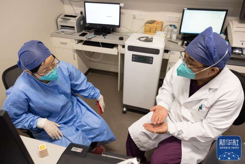 ↑12月27日,在上海交通大学医学院附属新华医院儿童急诊ICU阳性病区,新华医院儿急危重症医学科主任朱晓东(右)和副主任医师朱月钮在商量工作。