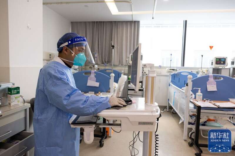 ↑12月27日,在上海交通大学医学院附属新华医院儿童急诊ICU阳性病区,医生在输入病例信息。