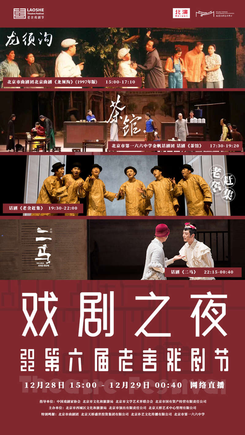 12月28日,由北京市西城区文化和旅游局、北京市演出有限责任公司、北京天桥艺术中心共同主办的第六届老舍戏剧节“戏剧之夜”大型云直播活动,从15:00开始到次日0:40结束,十多家媒体同步直播。