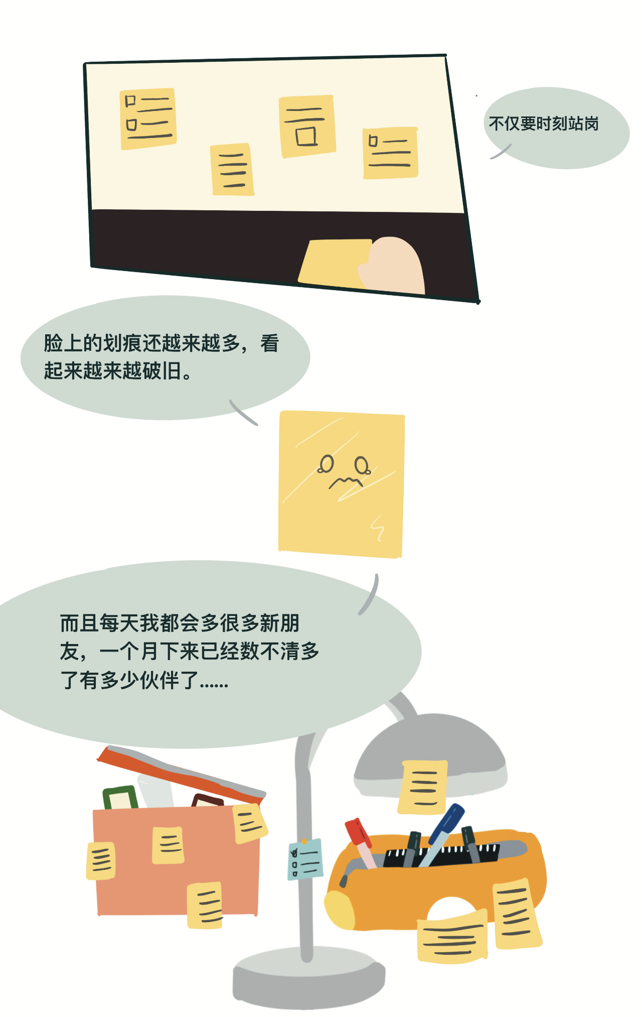 台灯、笔盒、笔、便签条