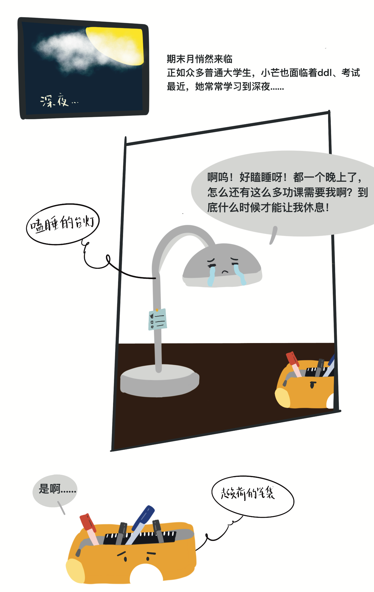 期末月的到来让我们与书桌相伴的时光变得越来越长,在你的书桌上是否也有一些特别的摆件陈设一直陪伴着你在期末月一起奋斗呢?先跟随萌主让我们一起来看看主人公“小芒”书桌上的“它们”是怎样度过期末月的吧!