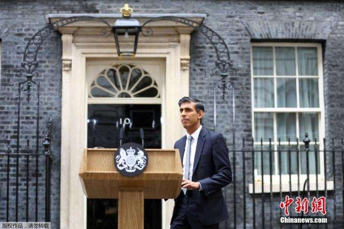 资料图:当地时间10月25日,英国新首相里希·苏纳克在英国首相府外发表就职演讲。