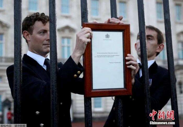 资料图:工作人员将英国女王伊丽莎白二世逝世的公告挂在白金汉宫大门上。