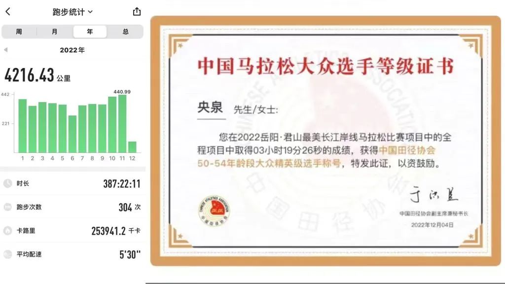 这一年, 外语院央泉教授身体力行,坚持长跑,符号“↗”背后,是他对中南学子坚持运动、保持健康的期望 。“我平时鼓励自己的学生,在校期间关注两件事:Sport & Study。”央泉教授在2022年跑步共计4216.43公里,参加数次马拉松长跑比赛。他用“↗”强调运动对于生命向上向善的作用,他说:“身体是革命的本钱,也建议我的学生加入跑步这项健康的运动,希望大家都能以强健的身体迎接新的挑战!”