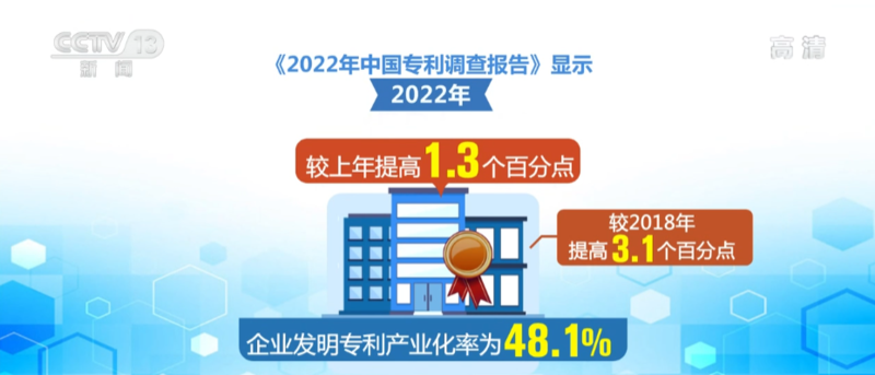 《报告》显示,2022年,我国有效发明专利产业化率为36.7%,较上年提高1.3个百分点。其中,企业发明专利产业化率为48.1%,较上年提高1.3个百分点,较2018年提高3.1个百分点。
