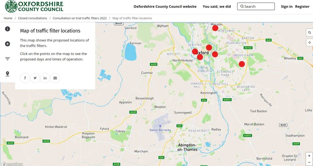 从牛津郡议会官网的定点地图也可以看出,六个“交通过滤器”的分布呈点状,并非网传的“区域式”划分。