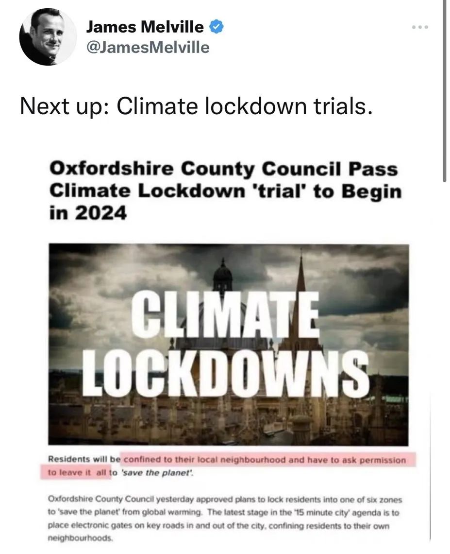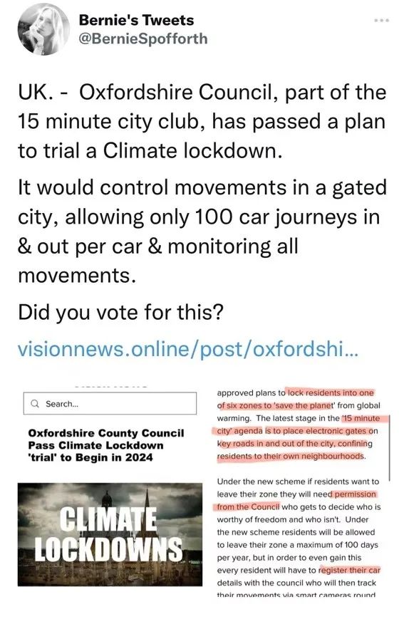 一名推特用户在推文里写道:“作为‘15分钟城市’俱乐部的一份子,牛津郡议会已经通过了一项试行‘气候封锁’的计划。” 该用户还上传了一篇文章的截图并警告说:“居民将被限制在当地社区内。”