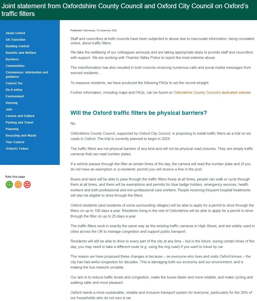 12月7日,牛津市议会和牛津郡议会在一份联合声明中驳斥了网传说法,表明这项举措不会将人们限制在特定区域,没有通行证的司机也可以在不被罚款的情况下进入整个城市,只需要行驶其他路线或通过环路来避开“交通过滤器”。