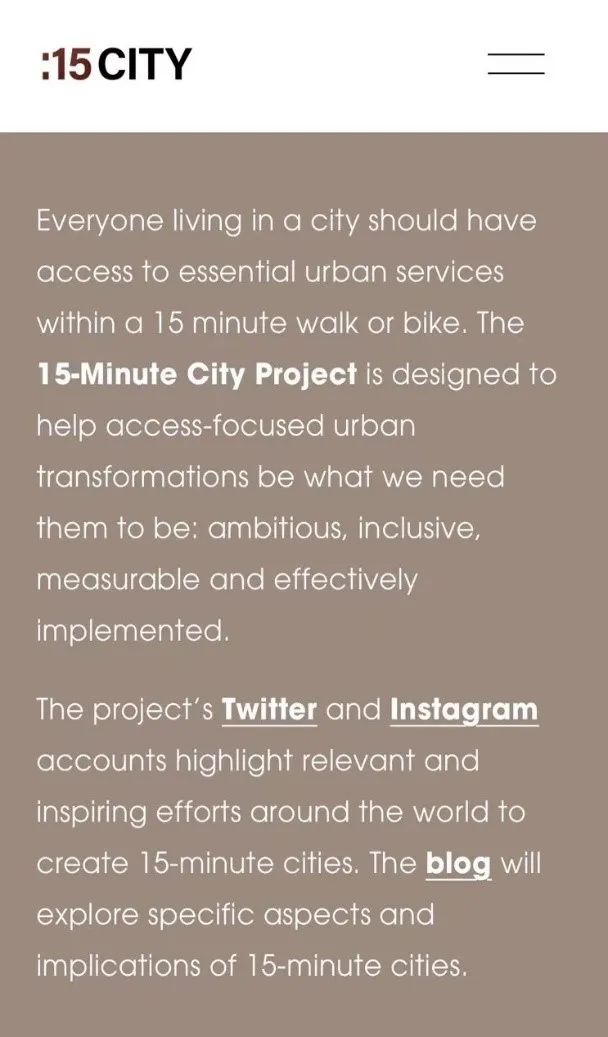 另一方面,网传推文中提到的“15分钟城市”是由旧金山城市规划学家Dan Luscher发起的项目。该项目主张在理想情况下,城市居民从家里步行或骑自行车15分钟以内就能获得配套齐全的城市基础设施服务。项目主要提供全球性的“15分钟城市活动”信息库,以促进城市交流。