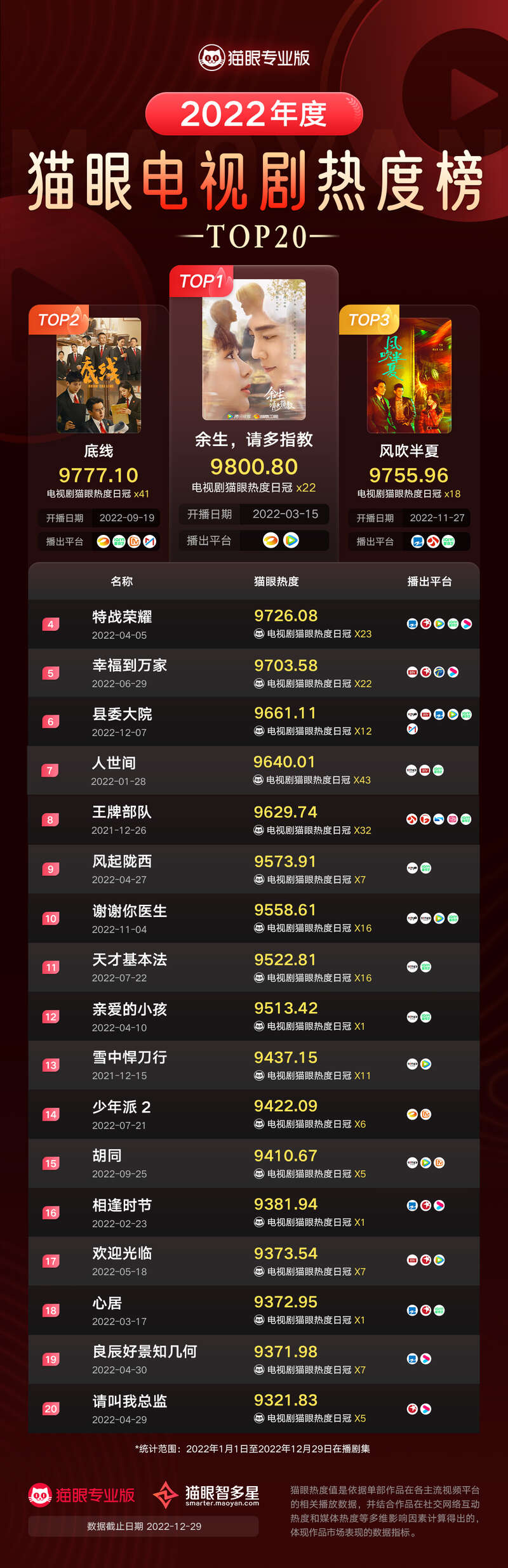 2022年电视剧热度榜前三位分别为《余生,请多指教》《底线》《风吹半夏》。其中由杨紫和肖战领衔主演的《余生,请多指教》成为2022年热度最高电视剧TOP1,在播放期间共获得22次电视剧热度日冠和16次卫视直播关注度日冠;由靳东、成毅、蔡文静主演的《底线》,和赵丽颖、欧豪、李光洁主演的《风吹半夏》,分别位列TOP2和TOP3。