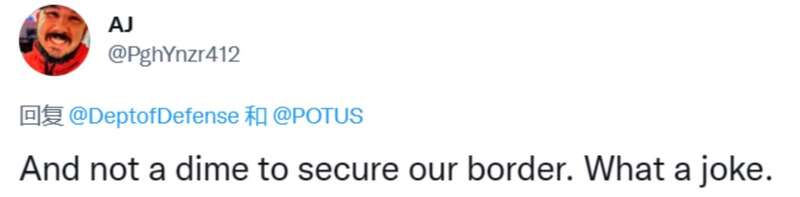 网友@AJ说,(美国国防授权法案里)没有一毛钱是用来保护我们自己的边境,真是个笑话。